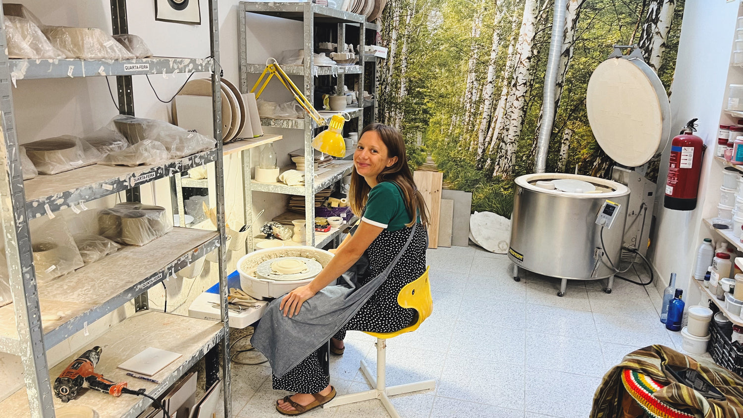Ich kam in Begegnung mit Töpfern an einem heißen Sommertag 2022 in Portugal. Mit meinem Freund Steve habe ich an einem 8-stündigen Drehkurs in Porto teilgenommen. Wir waren so begeistert von dem Drehen, dass wir uns, nachdem wir aus dem Urlaub wieder zu Hause waren, eine Drehscheine gekauft haben. Viel Platz hatten wir in der Wohnung schon damals nicht; für die neue Scheibe habe ich eine kleine Ecke meines Arbeitszimmers befreit und seitdem ist sie da und begleitet mich jeden Tag bei der Herstellung.