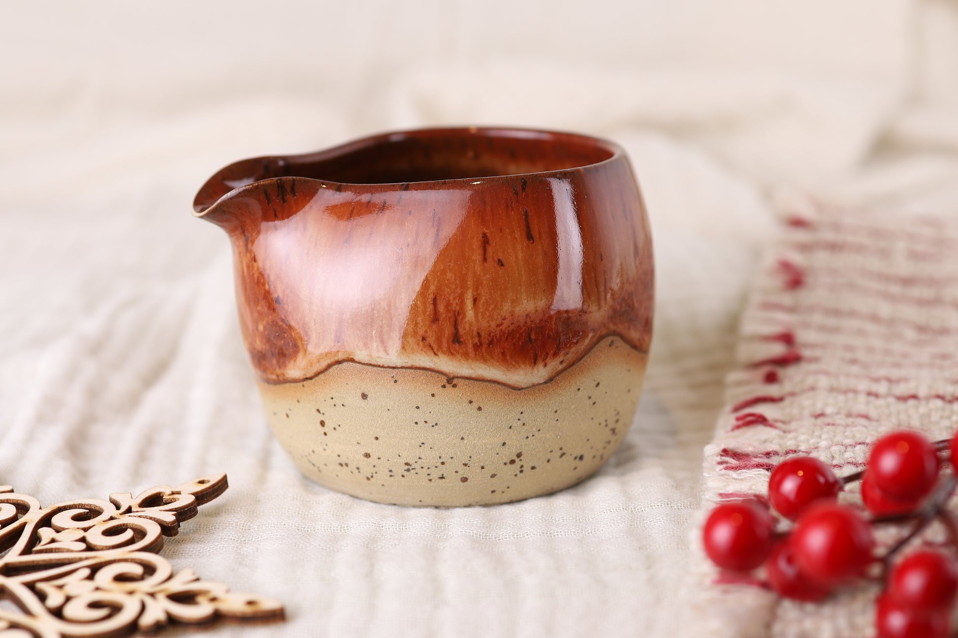 Dieses kleine Steinzeugkännchen ist ideal zum Servieren von Milch, Sahne, Sirup oder Sojasauce. Mit seiner schlichten Tülle und dem reduzierten Design findet es sowohl auf dem Frühstückstisch als auch beim Kaffeekränzchen seinen Platz. Pflegeleicht und funktional – eine schöne Ergänzung zu deiner Keramikserie.