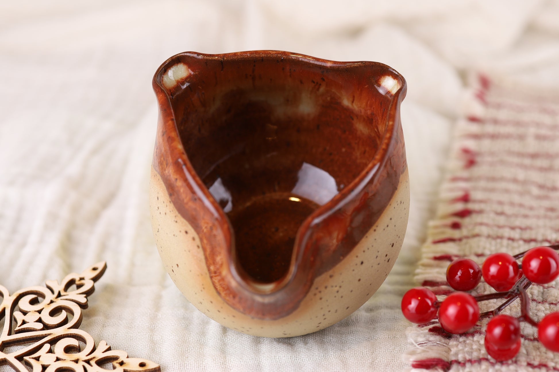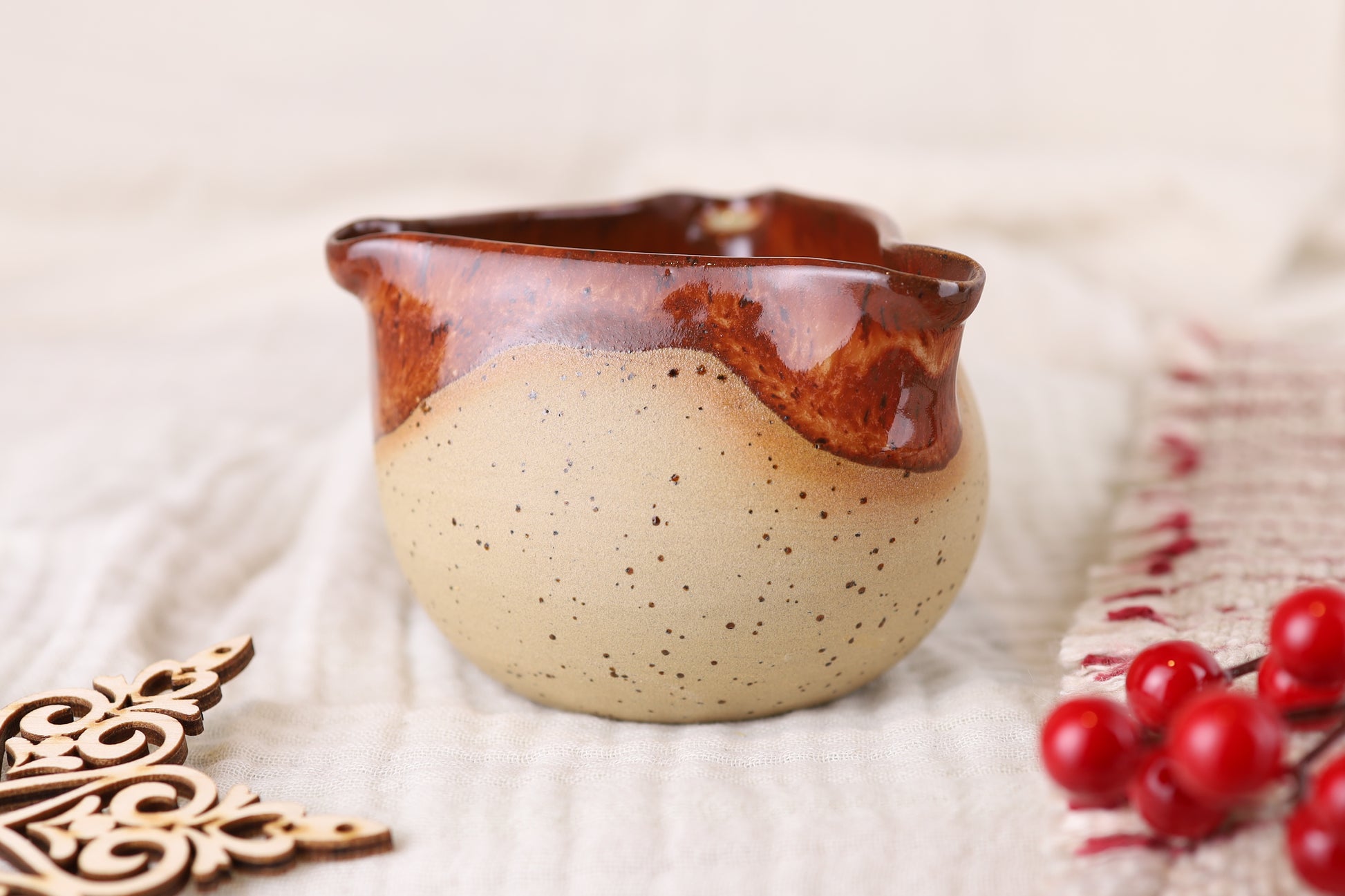 Dieses kleine Steinzeugkännchen ist ideal zum Servieren von Milch, Sahne, Sirup oder Sojasauce. Mit seiner schlichten Tülle und dem reduzierten Design findet es sowohl auf dem Frühstückstisch als auch beim Kaffeekränzchen seinen Platz. Pflegeleicht und funktional – eine schöne Ergänzung zu deiner Keramikserie.